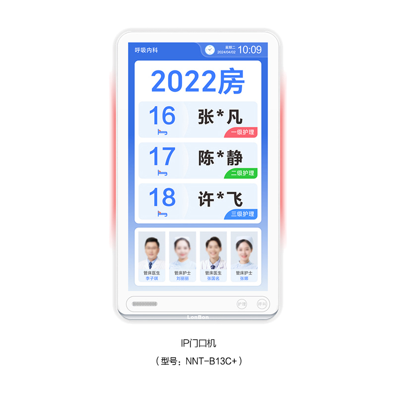 • 采用13.3英寸触摸显示屏,内置灯带双侧发光设计,壁挂式安装在病房门口。